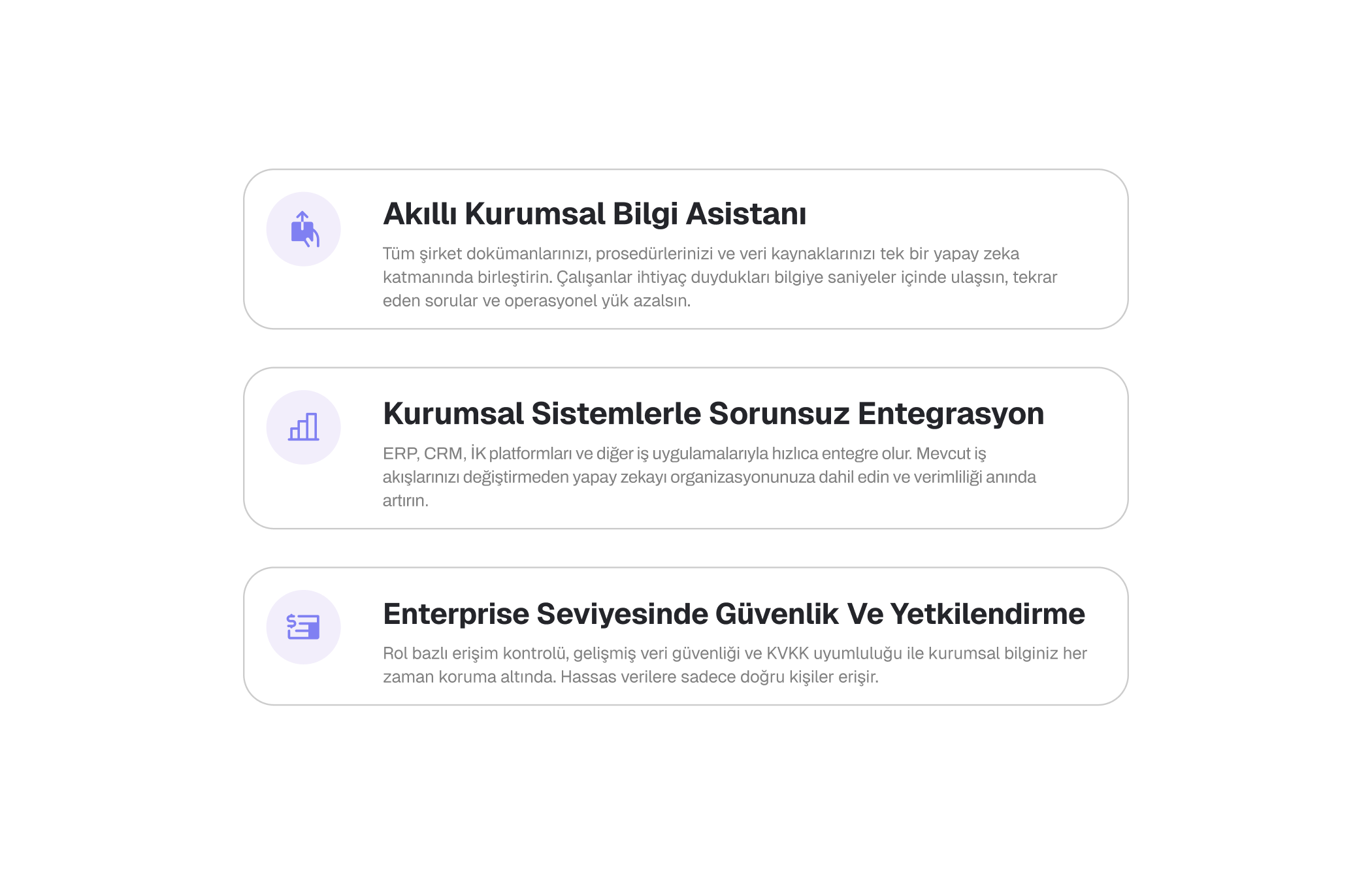 “İzin hakkım ne kadar kaldı?”, “Satın alma süreci nasıl ilerliyor?”, “Gider politikası nedir?”, “Yeni proje için hangi adımları izlemeliyim?” gibi günlük operasyonları etkileyen sorulara saniyeler içinde yanıt verin.